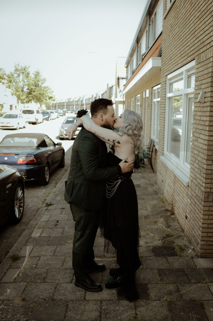 Maar, dat het geen standaard bruiloft zou worden… dat was al vrij snel duidelijk. De zoektocht naar een trouwjurk en trouwpak drukte al een mooi stempel op hun bijzondere dag. Roy: “Het was voor mij vooral de kleur die ik zocht. En die was perfect. Het is niet een standaard kleur voor een bruiloft, maar dat zijn wij ook niet.” Roy vond zijn trouwpak bij HKC Hony in Zwolle.